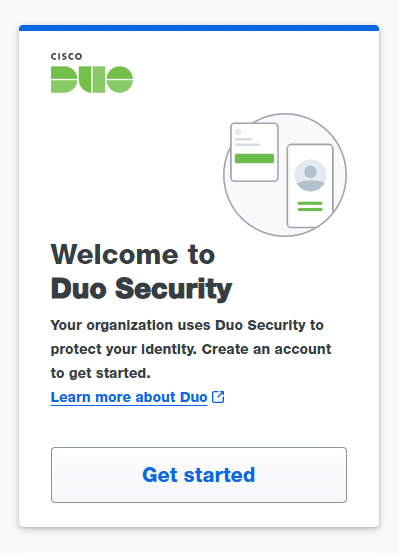 You will receive an email advising you of your enrollment in Duo Security. Clink on the link in the email to begin the setup process, when the site loads click on the Get Started button: